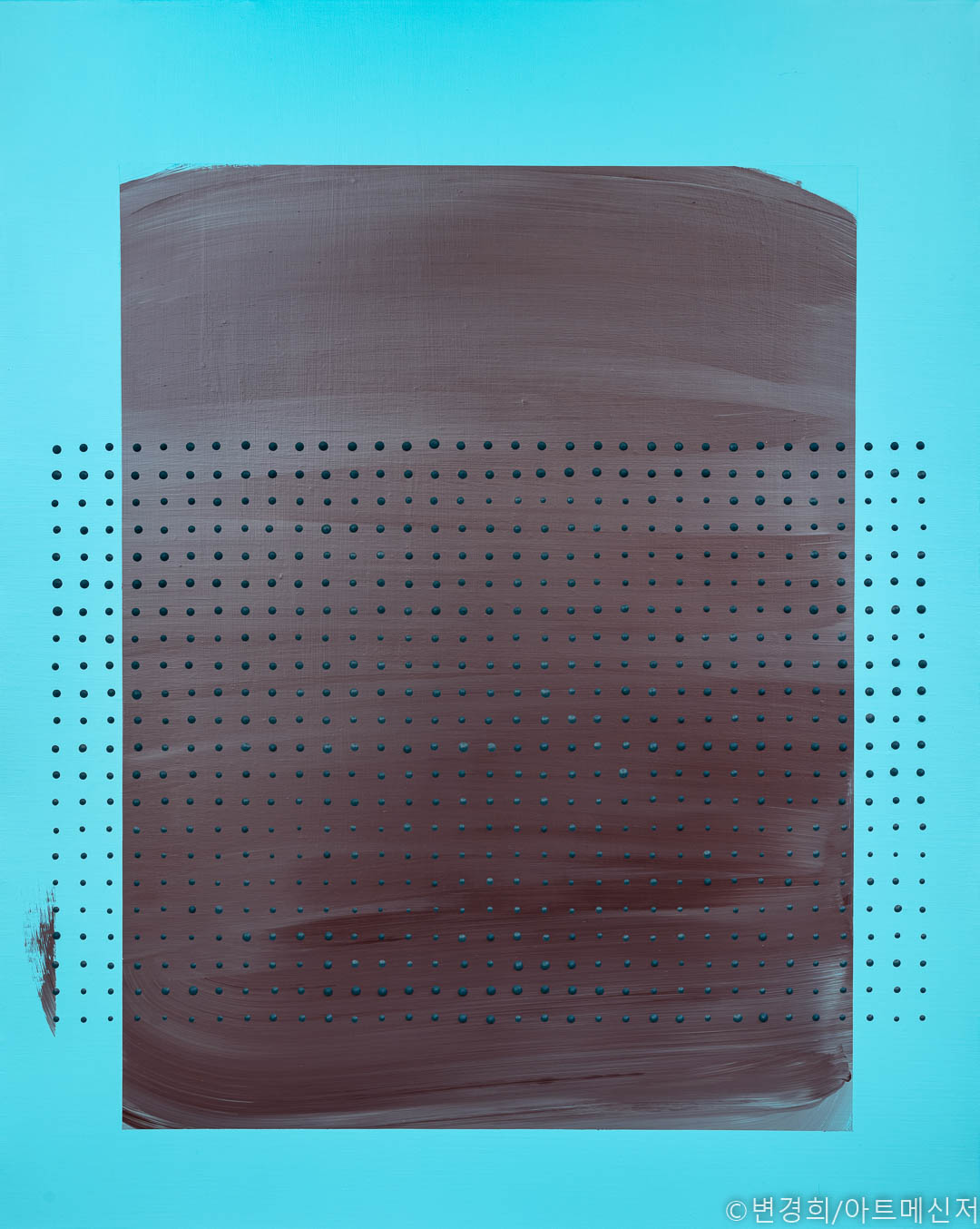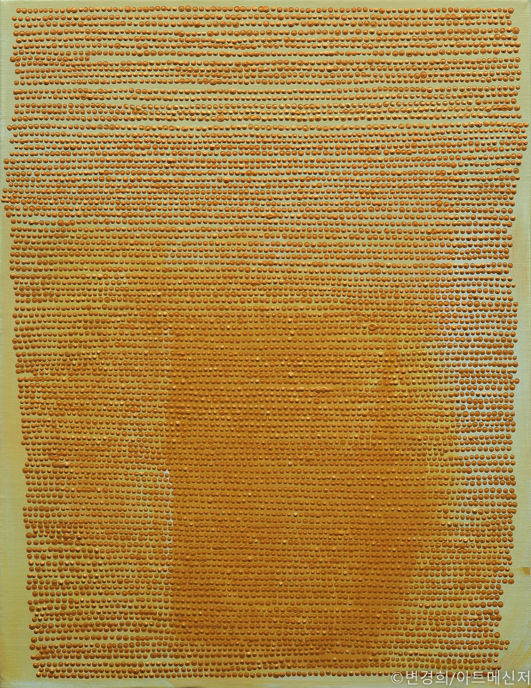점을 그리는 것이 아닌, 점찍기라고 했다. 여기에는 무슨 차이가 있는가. 작가는 흔히 그렇게 하듯 캔버스를 세워놓고 그림을 그리는 것이 아니라, 화면을 바닥에 깔아놓고 점을 찍는다. 여기에는 그러므로 붓질에 가해지는 힘 조절을 통해 물감이 흘러내리는 것과 같은, 혹 있을 수 있는 가변성과 우연성이 끼어들 여지가 거의 없다. 오롯이 정신을 집중해 점을 찍는 것인데, 그저 점을 찍는다기보다는 점을 쌓아 올리면서 만든다. 존재에 살을 붙이고 몸을 부여한다고 해야 할까. 그렇게 화면은 살이 붙고 몸을 얻은 존재의 점들로 가득하다. 얼핏 어슷비슷해 보이지만, 사실 같은 것이 하나 없는 존재의 점들로 가득하다. 존재가 꼭 그렇지 않은가. 그렇게 돋을새김 된 점들이 손으로도 만져지고 눈으로도 보이는데, 저부조 형식의 화면이 평면과 입체의 경계를 넘나들면서 허문다. 잠재적으로 조각을 품은 회화를 통한, 회화의 확장을 꾀한다고 해야 할까.