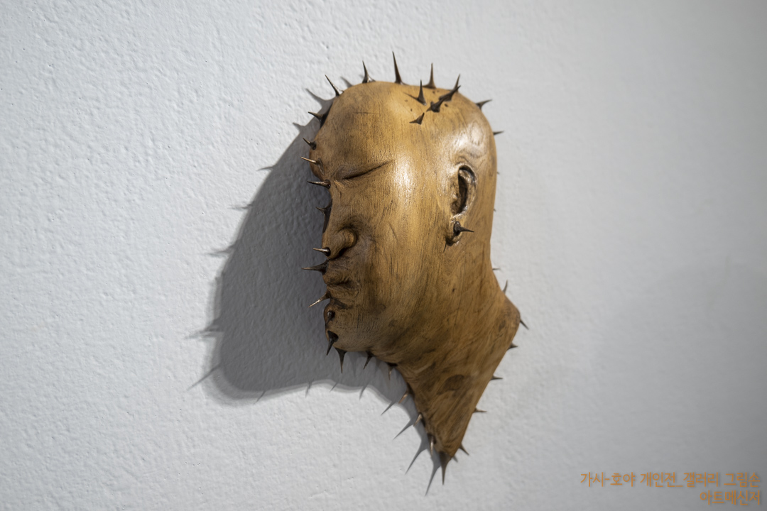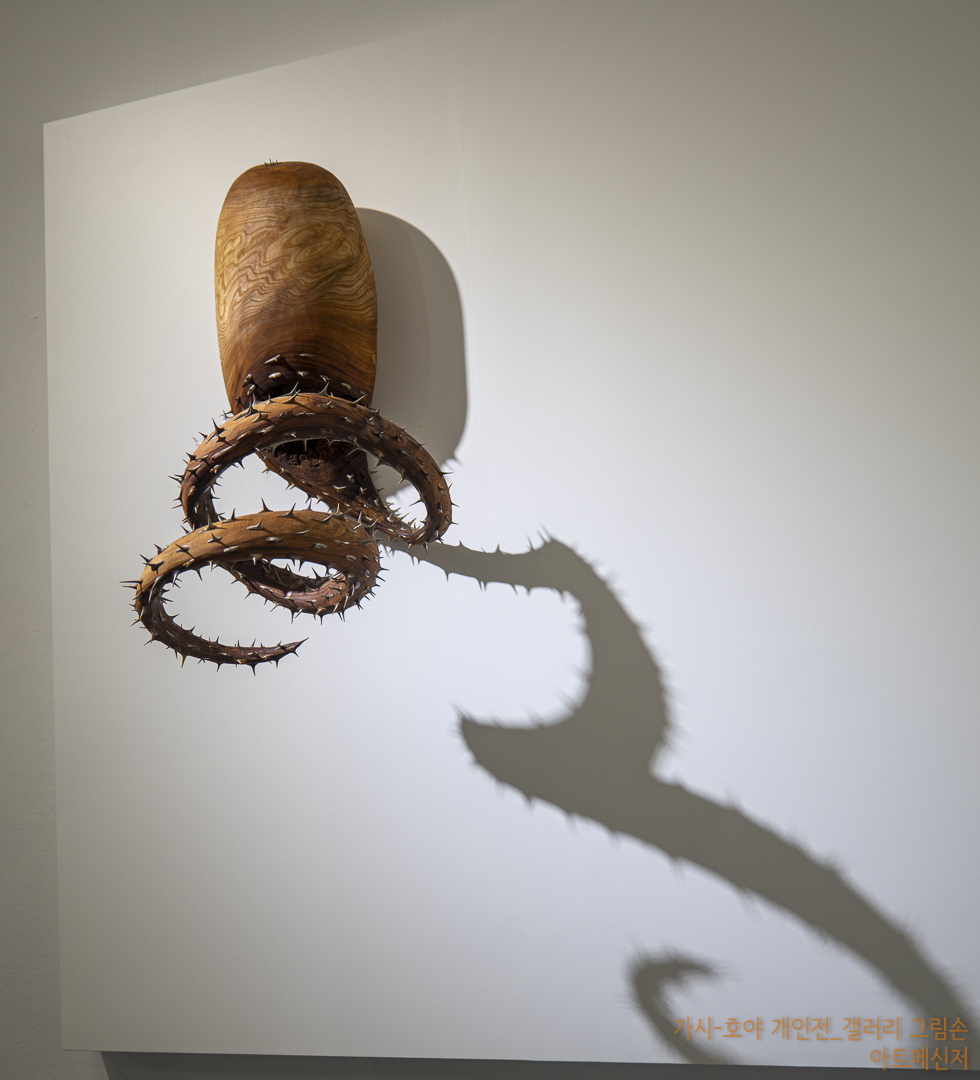 세상이란 보호막을 더이상 신뢰하지 않고 오직 자신만이 자신을 보호할 수 있다는 선언처럼, ‘가시'는 호야 작가에게 큰 오브제로 사용되고 있다. ‘가시'는 가시적 거리임에도 만질수 없고 다만 보기만 해야한다. 촉감보단 시각적 거리를 담보해야만, '가시'는 '가시'로서 존재감을 드러낸다. 그러한 ‘가시’의 숙명이 아이러니하게도 호야 작가의 작품 속에 녹아들어, 작가의 새로운 작품관을 이끌어내고 있다.