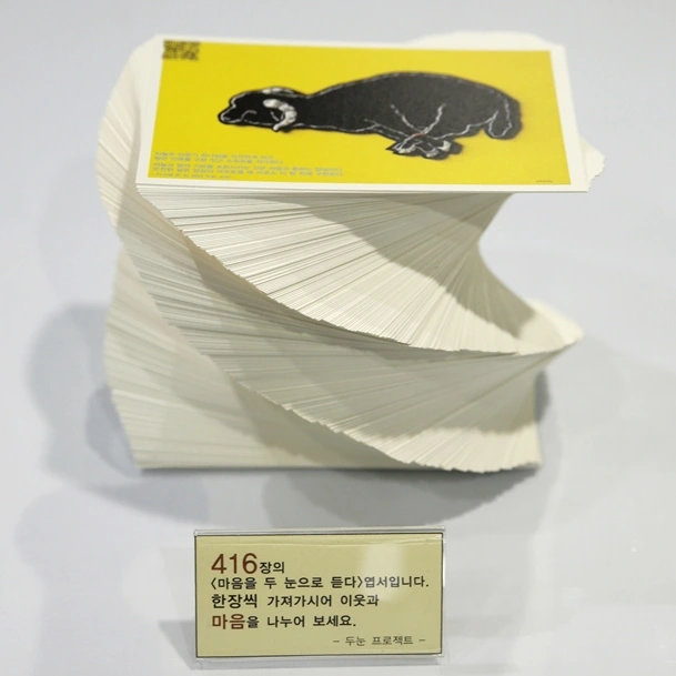 이것이 계기가 되어 산삼 기부의 날 실천으로 진상규명에 의지가 있는 정치인이 선출되어야 하기에 투표 독려 영상도 만들게 되었습니다. <현시대의 양심>, <두눈체-투표>, <마음을 두눈으로 듣다!>엽서 416장 그리고 기부자 분들이 습관을 거슬러 모아준 수천 조각의 손톱이 출연하는 영상으로 안산 합동 분향소에서 촬영해 만든 었습니다.