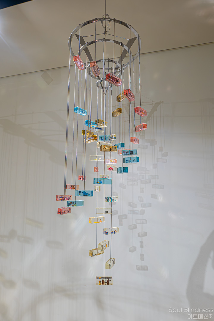 atelierJAKㅣIndescribable scenes 7sㅣepoxy resin cube-7.6×2.6×2.6cm, acrylic paintings on overhead transparency, stainless steel polishedㅣ40×40×120cmㅣ2021