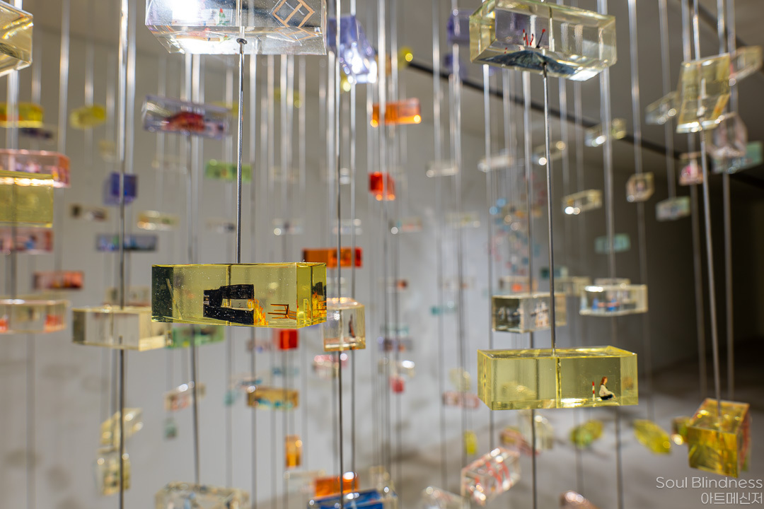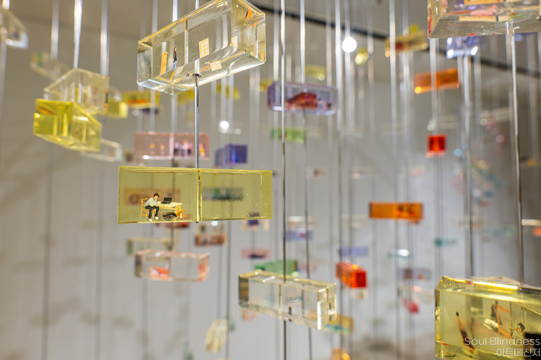 atelierJAKㅣIndescribable scenes 5sㅣepoxy resin cube-7.6×2.6×2.6cm, acrylic paintings on overhead transparency, stainless steel polishedㅣ120×120×180cmㅣ2021
