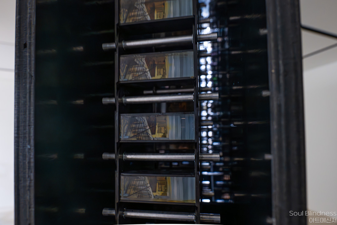 atelierJAKㅣJack's windowㅣepoxy resin cube, acrylic paintings on overhead transparency, mdf board, steel, electric control box,wood boardㅣ310×220×45cmㅣ2022
