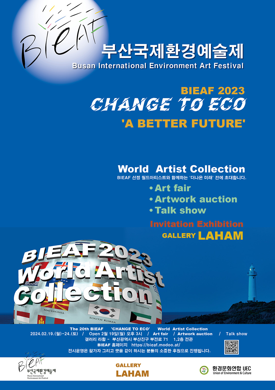 BIEAF ‘부산국제환경예술제'는 2000년 출범하여 2023년 20회를 맞이하였습니다. 제20회는 'Change To ECO'를 주제로 50개 국가 226명의 아티스트가 참여하였습니다. BIEAF운영위원회는 2023년 9월부터 2024년 2월까지 온라인과 오프라인 갤러리 전시에 참가한 아티스트 중에서 최고의 50인 아티스트를 선발 하였고 지난 1월은 최종적으로 10명을 선발하였습니다. World Artist Collection Exhibition은 선발된 최고의 아티스트와 함께 '보다 나은 미래'를 만들어 가는 전시입니다. 최고의 작가로 선발된 아티스트와 전시에 초대한 국내 86명의 아티스트는 미래의 미술을 향하여 세계 여러 나라의 아티스트와 글로벌 아트웍을 만들어갈 것입니다. 이 행사를 기념하며 아트페어와 함께 다양한 인문학 이벤트가 진행됩니다. 온라인과 오프라인이 동시에 진행되며, 유익한 관람 서비스를 제공하는 Change To ECO '보다 나은 미래' 전에 많은 관람 바랍니다. - 2024. 02. BIEAF2023 운영위원회