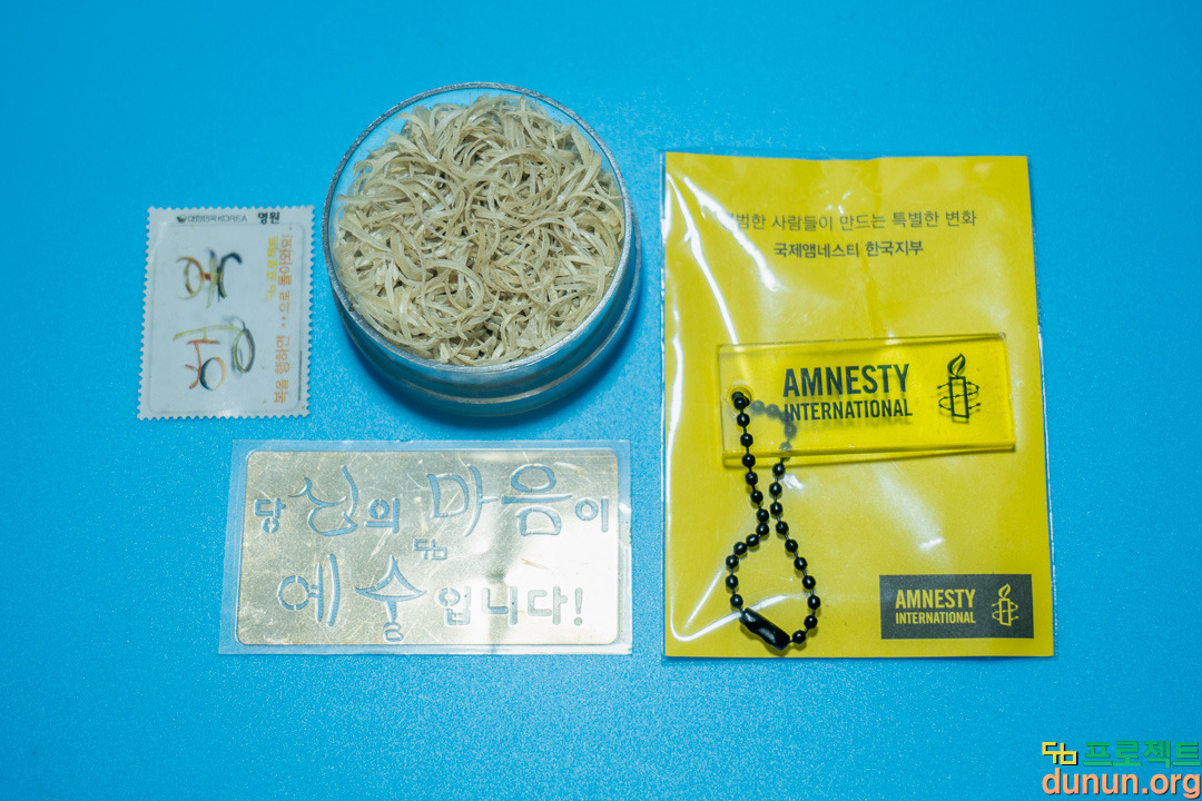 예전에 드렸던 두눈프로젝트 기념품과 함께 “특별한 사람이 만드는 특별한 변화” Amnesty International 고리도 함께 주셨다. 국제앰네스티였고 누구나 차별 없는 인권을 누릴 수 있는 세상을 위해 활동하는 단체인데 두눈프로젝트와 통하는 부분이 있다.