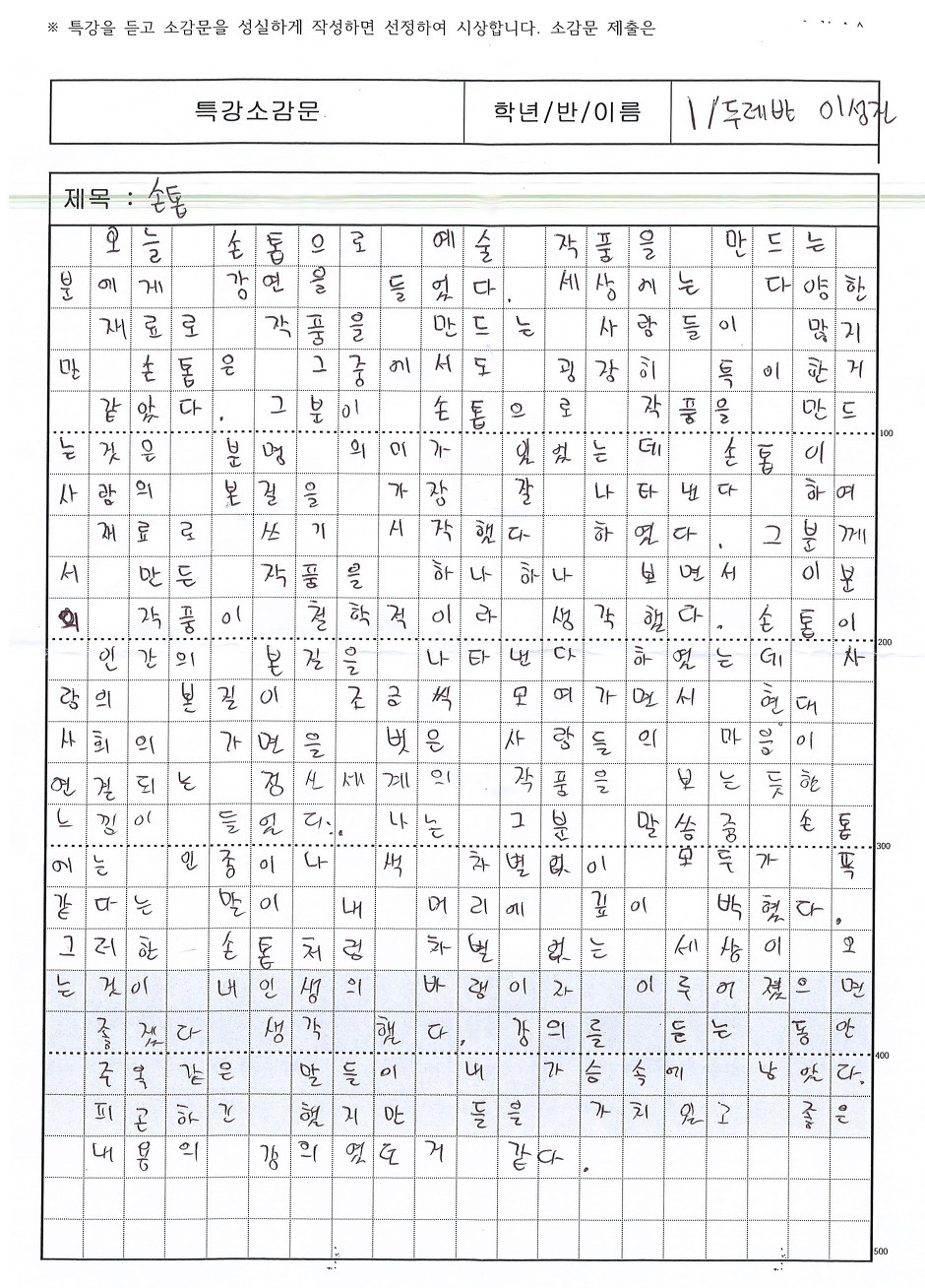 예전 두레자연고등학교에서 <깨어나 꾸는 꿈>을 주제로 특강을 한 적이 있는데 담당 선생님께서 한 학생이 쓴 <손톱>이란 제목의 소감문을 보내주셨다.