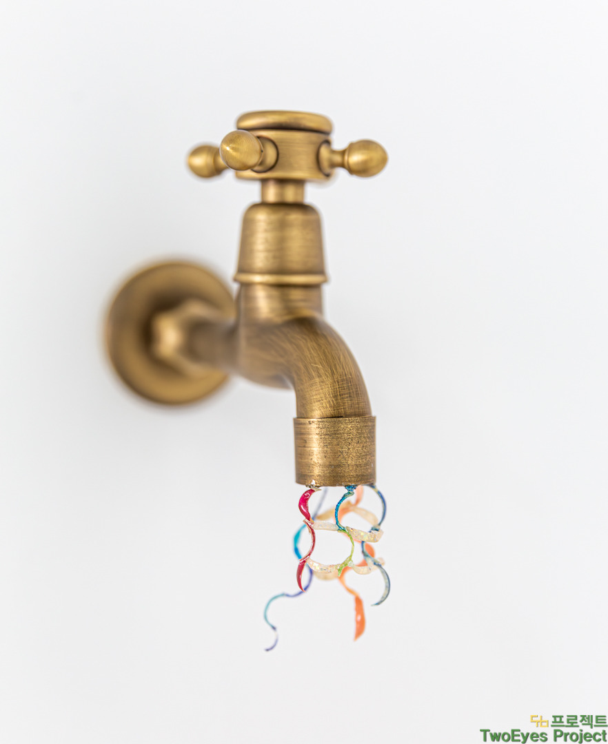 투명한 물이 흘러야 하는 수도꼭지에 기부자 자신을 상징하는 색이 칠해진 손톱을 이어 붙였다.