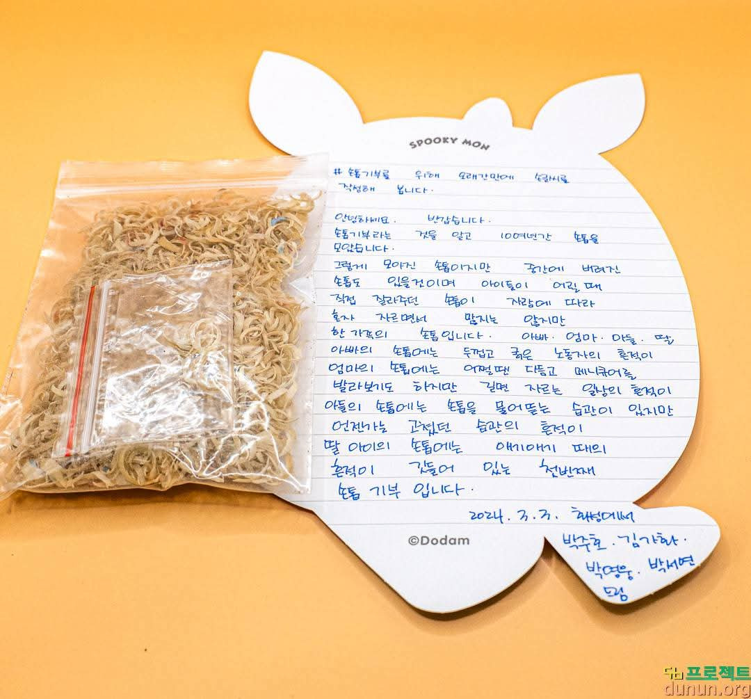 한 가족이 동참하여 이렇게 오랜 기간 보내 주신 건 처음이네요. 오래간만에 손 글씨를 써 본다며 아빠, 엄마, 아들, 딸 이상적인 네 가족의 손톱에 관한 이야기를 담아 보내주셨네요. 디지털이 현실을 지배하는 시대에 아날로그적 감수성을 나눌 수 있음도 두눈프로젝트의 장점이란 생각도 듭니다. 기부해 주신 손톱은 <온전한 삶을 위한 바람> 작품에 함께 하였습니다.