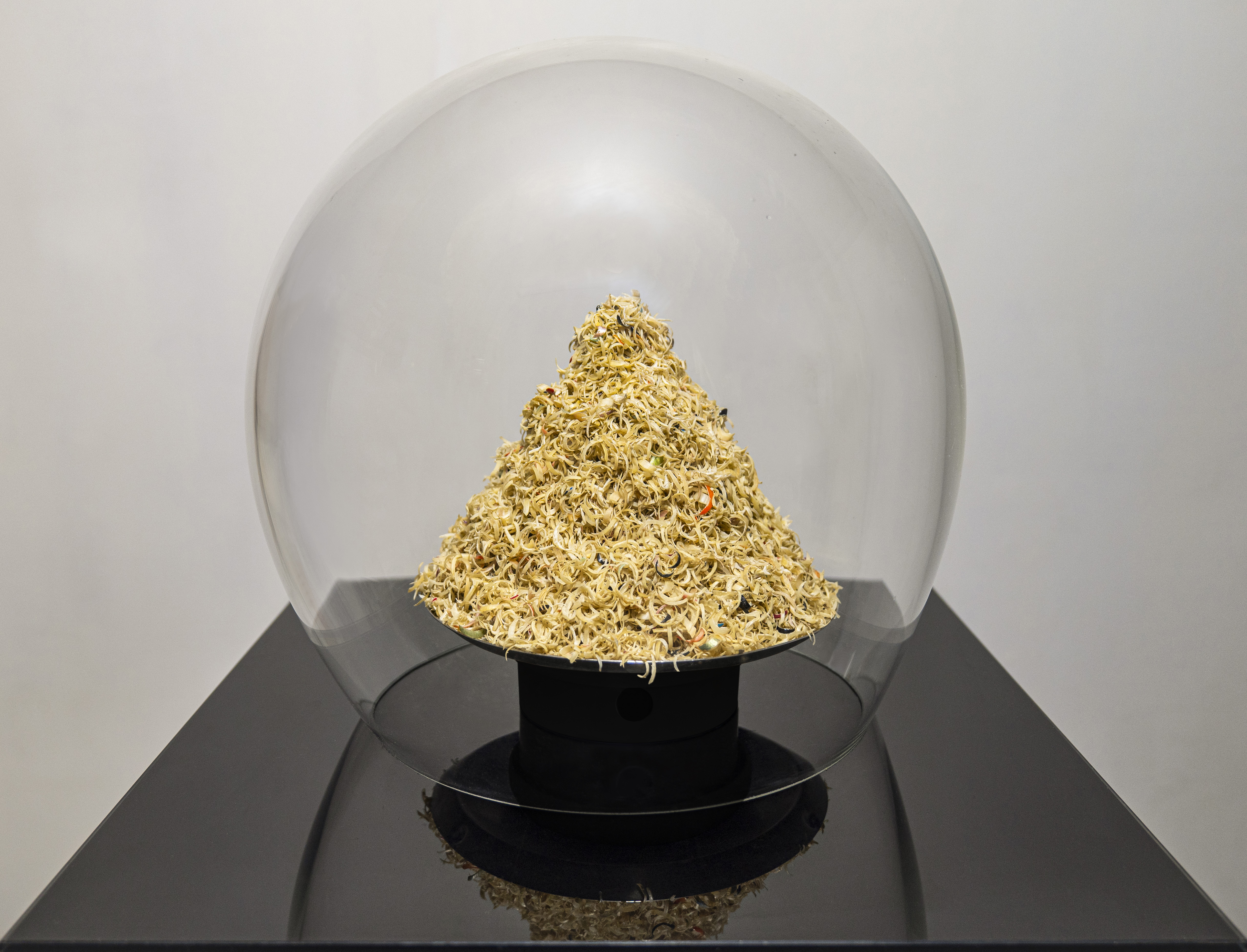 티끌 모아 태심 Many Motes Make Great Heart_ 기부받은 손톱, 유리, 스테인리스, 회전장치, 센서_32(h)x40.2x40.2cm_ 2025
