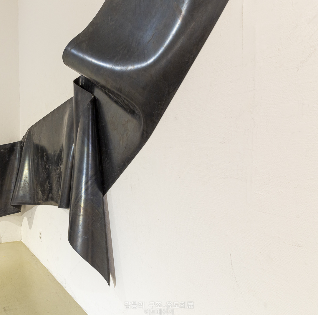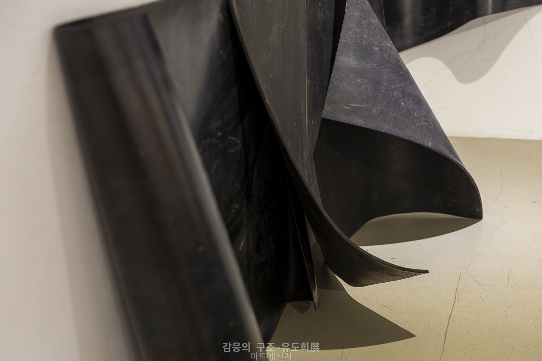 쓸모를 다한 고무의 물성에 작가는 탄성을 자아냈다. 바로, 고무의 유연한 바디와 질감, 무게와 냄새, 언뜻 차가워 보이는 외관 때문이다. 유도희가 만난 고무판은 단순히 ‘특이한 재료’를 넘어, 그 물성 자체로 작품의 의미와 경험을 바꾸는 놀라운 탄성(彈性)을 갖고 있었다. 전통 조각 재료인 돌과 나무에서는 느끼기 힘든 감각 즉, 인간의 피부처럼 고무는 감싸고 늘어지고 닿고 반응하고 감응하는 존재였다. 고무의 변형(용) 가능성은 조각이 고정된 형태라는 기존 관념을 해체하며 조각이 지닌 여러 전제를 무너뜨린다. 고무판은 환경에 따라 계속 변화하고 마모되고 균열을 낳는다. 휘고 말리고 반영하고 중력에 반응하며 자신이 놓인 상황에서 새로운 관계망을 형성한다. 그러면서 시간이 지나면 노화되고 부식되는, 고무판은 유한한 존재다.
