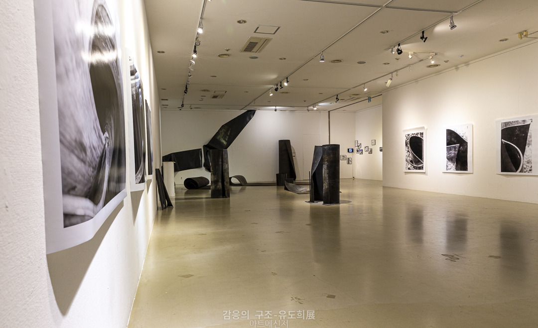 고양어울림미술관 2층에는 고무판과 그가 찍은 사진과 한때 고무가 살았던 숲 혹은 바다에서 불어오는 바람, 물, 천둥, 북소리가 ‘어울리’고 감응하며 보이지 않는 사건의 장소가 된다. 유도희 작가는 좌대 없이 고무판을 바닥에 두거나 세우고 벽에 부착하거나 양 끝을 늘어뜨리는 것으로 작업을 마무리한다. 그녀에게 조각(하기)은 행위일 뿐이다. 나머지는 조각이 바람과 압력, 주변의 환경에 따라 스스로 작품성을 드러내는 것이다. 이 모든 것이 지속적으로 일어나는 과정이기에 관객은 시각 중심에서 신체 전체로 확장해 전시를 관람해야 한다. 조각과 관람객 사이의 관계성이 새롭게 창조되는 몸으로 만나는 예술. 유도희의 고무판 작품은 감상 대상이 아니라 관람객과 함께 움직이는 존재이기에 눈으로만 보지 말고, 근육같은 생동감을 만지고 듣고 느껴보시길. 그때 전시장은 유기체적 생명 환경으로 되살아날 것이다.
