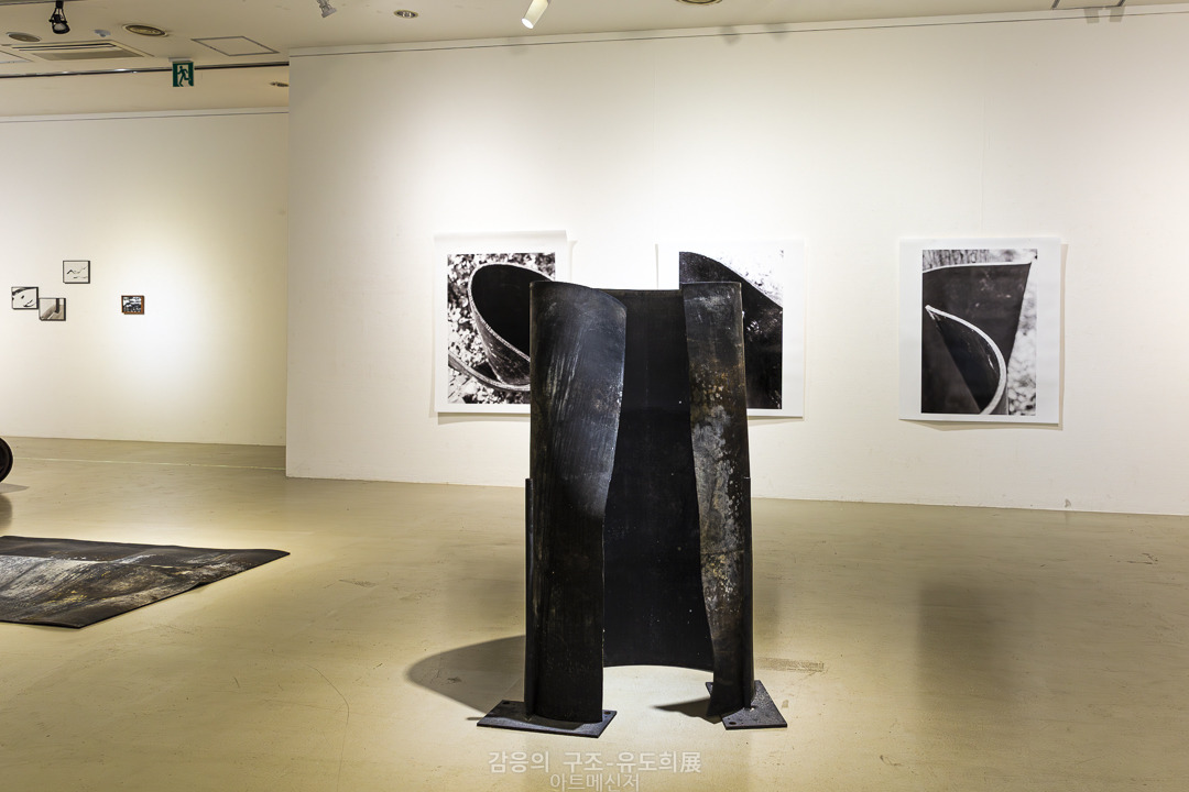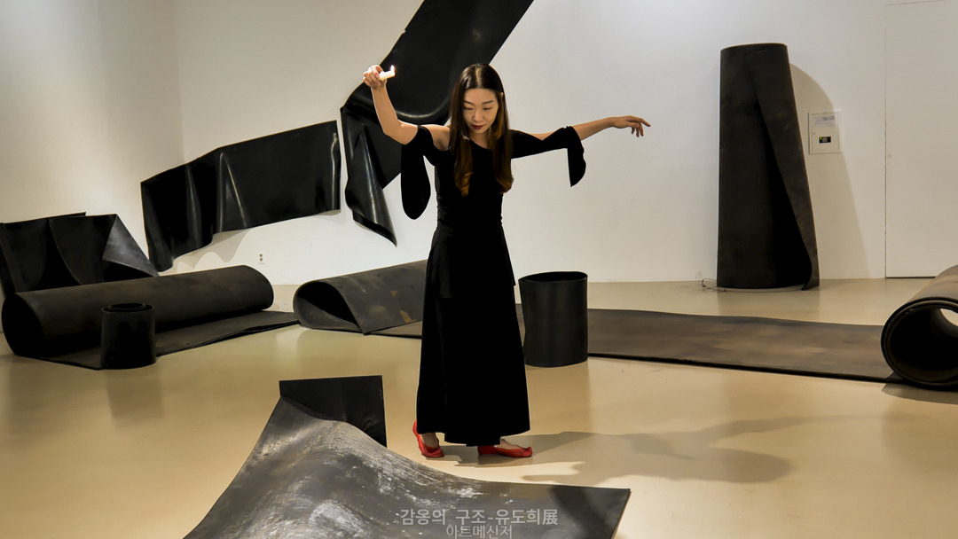 유도희 작가는 특정한 형상을 모방하지 않고 고무의 특성인 탄성과 유연한 회복력을 살려 ‘고무 그 자체로서의 조각’을 구현한다. ‘매체로서의 고무(판)’의 가능성을 보여주는 실험적인 접근이다. 작가는 그동안 들판, 바닷가, 흙길, 숲…에 고무판을 덩그러니 놓았다. 나무처럼 돌처럼 사람처럼 서 있거나 눕고 요기처럼 동작을 멈춘 채 선(禪)의 경지에 이른 검은 고무판을 사진으로 촬영한 후 어느 정도 시간이 지나면 다시 고무판과 함께 집으로 돌아왔다. 고무판과 작가 자신이 있어야 할 특별한 장소를 함께 경험하며 감각의 장(field)을 이루는 것이 그녀의 조각 행위이다. 스스로 매체가 되어 세계와 접속하는 이러한 몸짓이 귀하지 않을 수 없다.