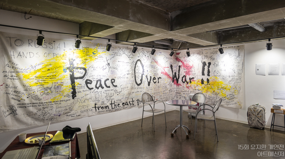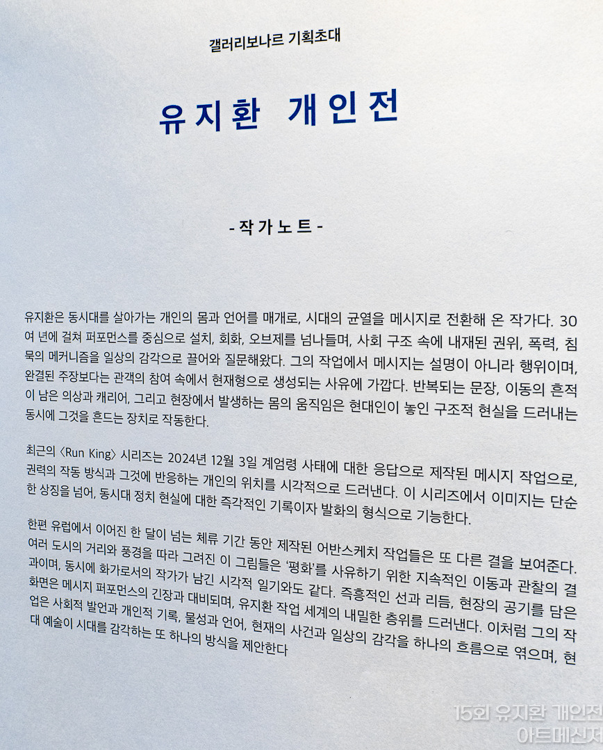 유지환의 이번 전시는 지난 10여 년간 이어온 그의 여러 예술 행적을 한 공간 안에 압축시켜 보여주는 자리이다. 그가 그 동안 행한 설치, 회화, 오브제, 퍼포먼스는 메시지 기반의 작업으로, 독립적인 장르와 개별 작품들이 각각의 주제를 가지면서도 콘텍스트를 형성하고, 이는 또 다른 하이퍼콘텍스트로 넘어간다. 그 간의 행적을 보여줌으로써 아카이브의 성격을 지니면서도 이번 전시를 통해 현재의 질문으로 이어져 미래의 응답으로까지 연결되는 통사적 맥락 또한 보여준다는 점에서 이번 그의 전시는 단순한 예술적 성과의 발표를 넘어선다. 작가는 이번 전시를 통해 관람객이 “전시장에 놓인 기록, 반복된 언어, 낡은 의상과 캐리어, 오브제, 그리고 새롭게 등장한 상징적 이미지들을 따라가며, 작가의 표현이 어떻게 생성되고 변화해 왔는지 직접 경험하게 된다”고 소개한다.